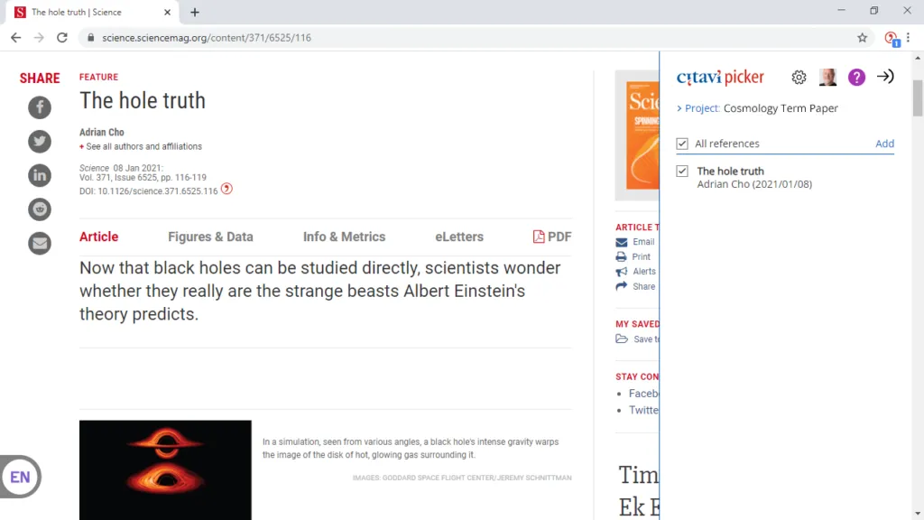 Сърфирайте и запазвайте: Винаги, когато намерите книга, статия или уеб страница онлайн, използвайте разширението Picker за Chrome, Firefox и Edge, за да изпратите бързо нейната информация и всеки наличен пълен текст към Citavi.