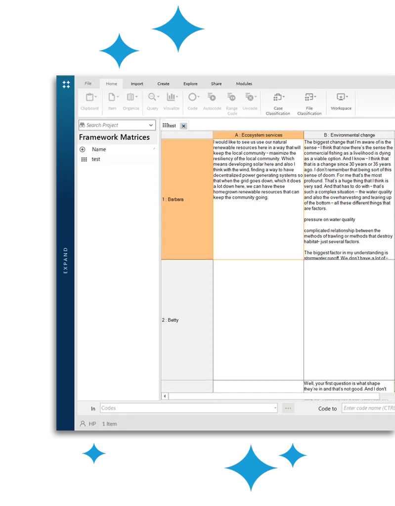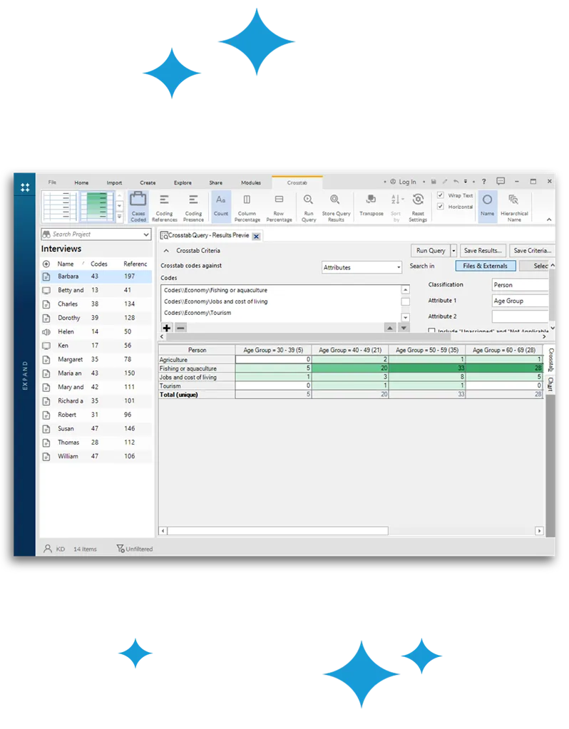 Задавайте сложни въпроси, за да откриете смисъла в данните си. Визуализирайте бързо информацията с диаграми на честотата на думите, облаци от думи (word clouds), диаграми за сравнение и много други. Търсете нововъзникващи теми и нагласи (sentiment analysis), като използвате специфични заявки. NVivo 14 добавя мощни нови инструменти за генериране на прозрения, които помагат на изследователите да ускорят процеса и да постигнат най-стабилния анализ.