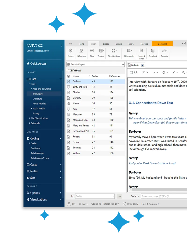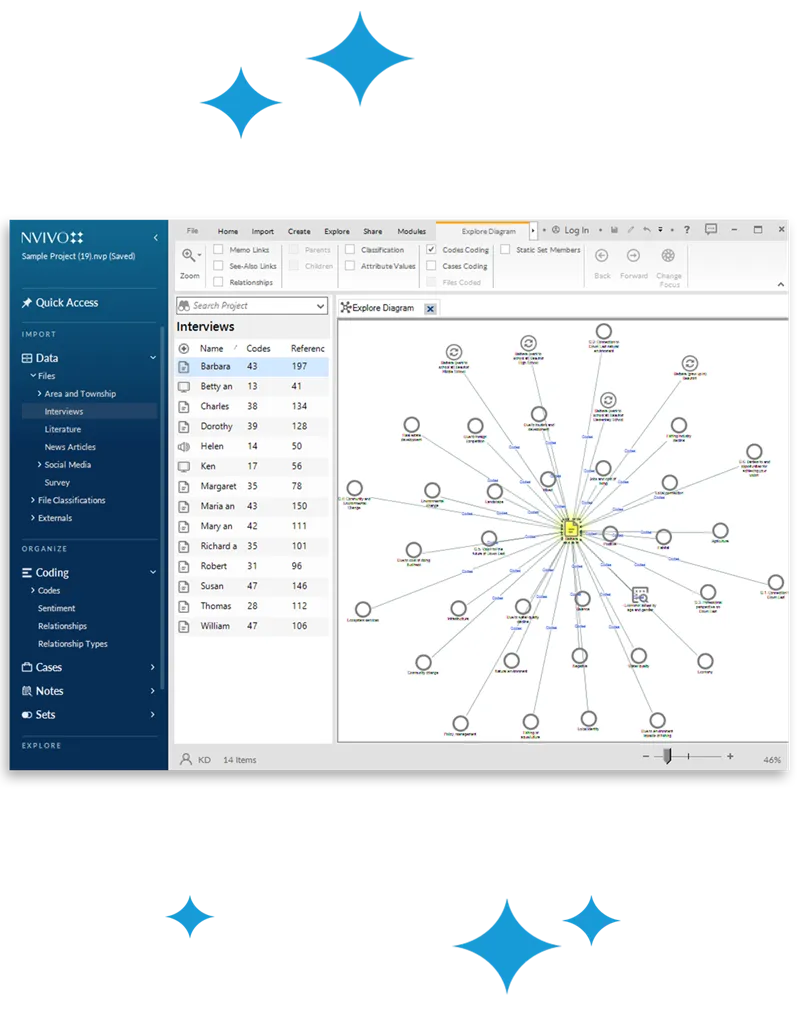 NVivo е най-широко използваният инструмент за качествен анализ на данни, а сега е още по-добър. NVivo не е само инструмент за организиране и управление на данни – той предлага интуитивно изживяване, което ви помага да разкриете по-дълбоки изследователски прозрения, като същевременно улеснява бързото и безпроблемно сътрудничество между екипите.