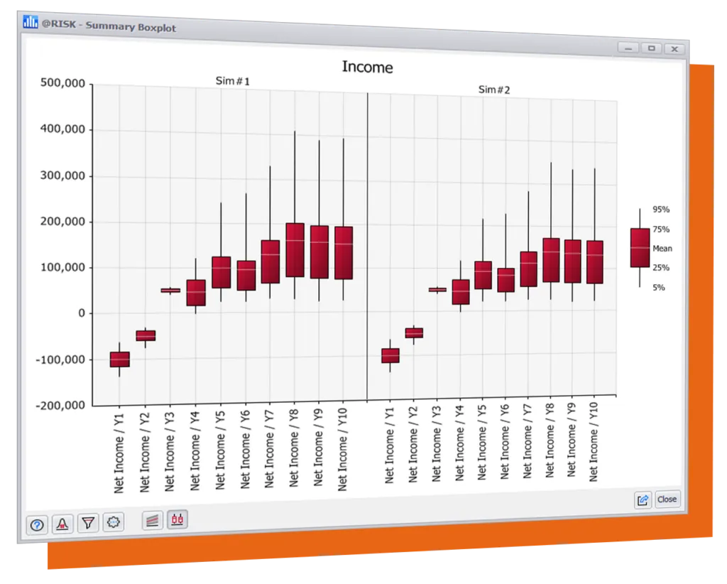 С богата библиотека от вероятностни разпределения, инструменти за напасване на данни и моделиране на корелации, @RISK ви позволява да представите всеки сценарий във всяка индустрия с най-високо ниво на точност.